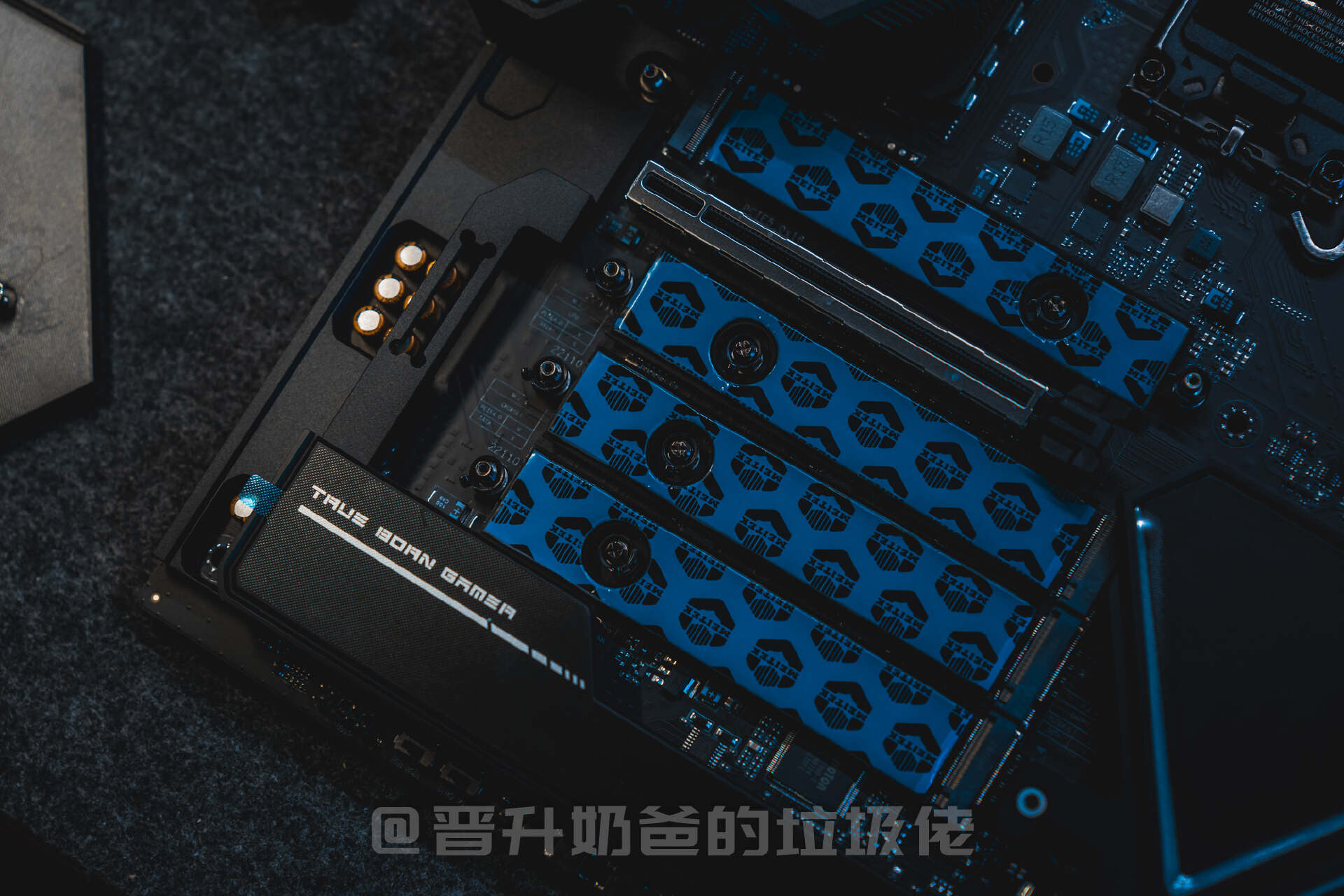 ▼在扩展插槽方面,主板配备一个采用合金加固设计以增强稳定性的PCIe 5.0 ×16插槽,还设有1条PCIe 4.0 ×4插槽和1条可转换为x16模式的PCIe 4.0 ×4插槽,这两条插槽被影藏在散热装甲下方,不使用的时候能够充分保证主板的整体美感。