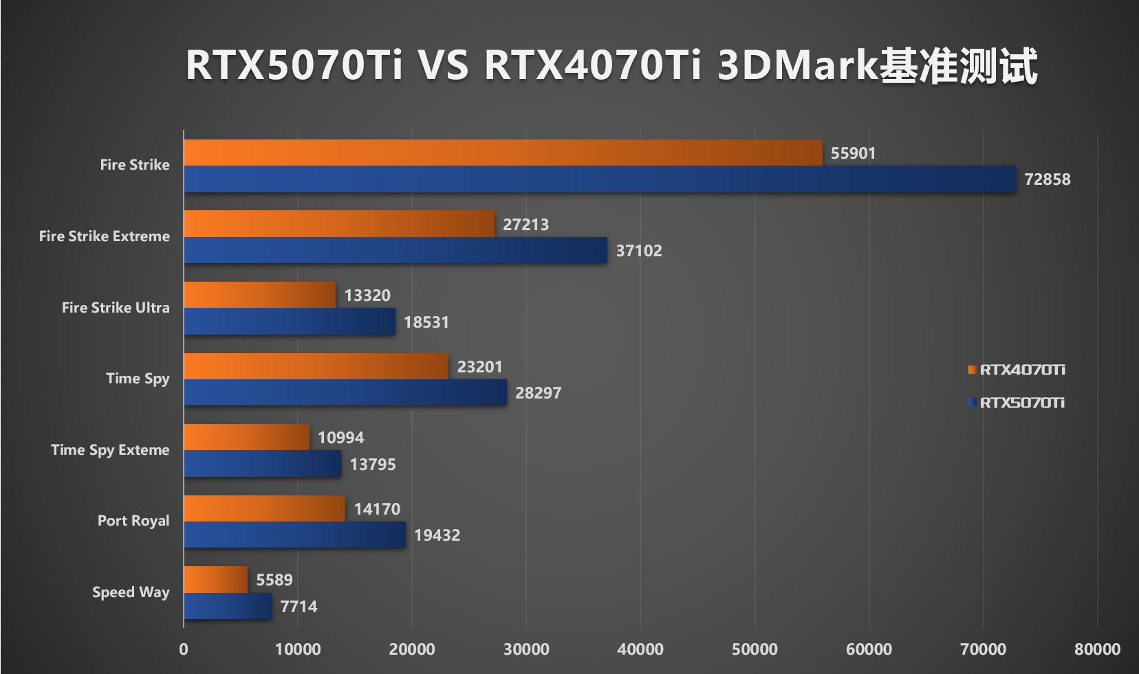 ▼首先进行3DMARK理论基准性能测试,显卡刚发布的时候大家好像都喜欢用RTX 5070Ti与RTX 4080系列显卡进行对比,我这里还是用上一代4070Ti进行对比,以展示其性能提升。综合来看,数值上性能提升较小的Time Spy项目提升也达到了22%,提升幅度最大的Fire Strike Ultra达到了39%,综合提升幅度32.6%左右。