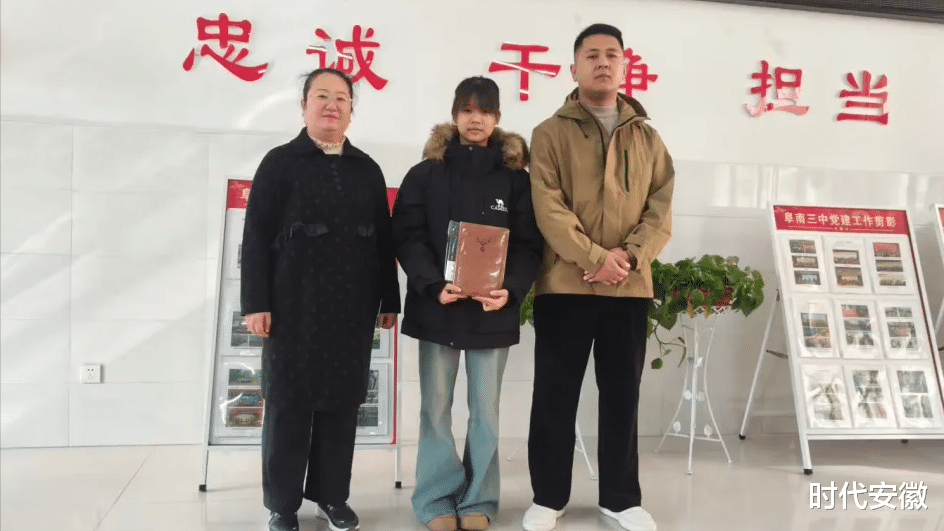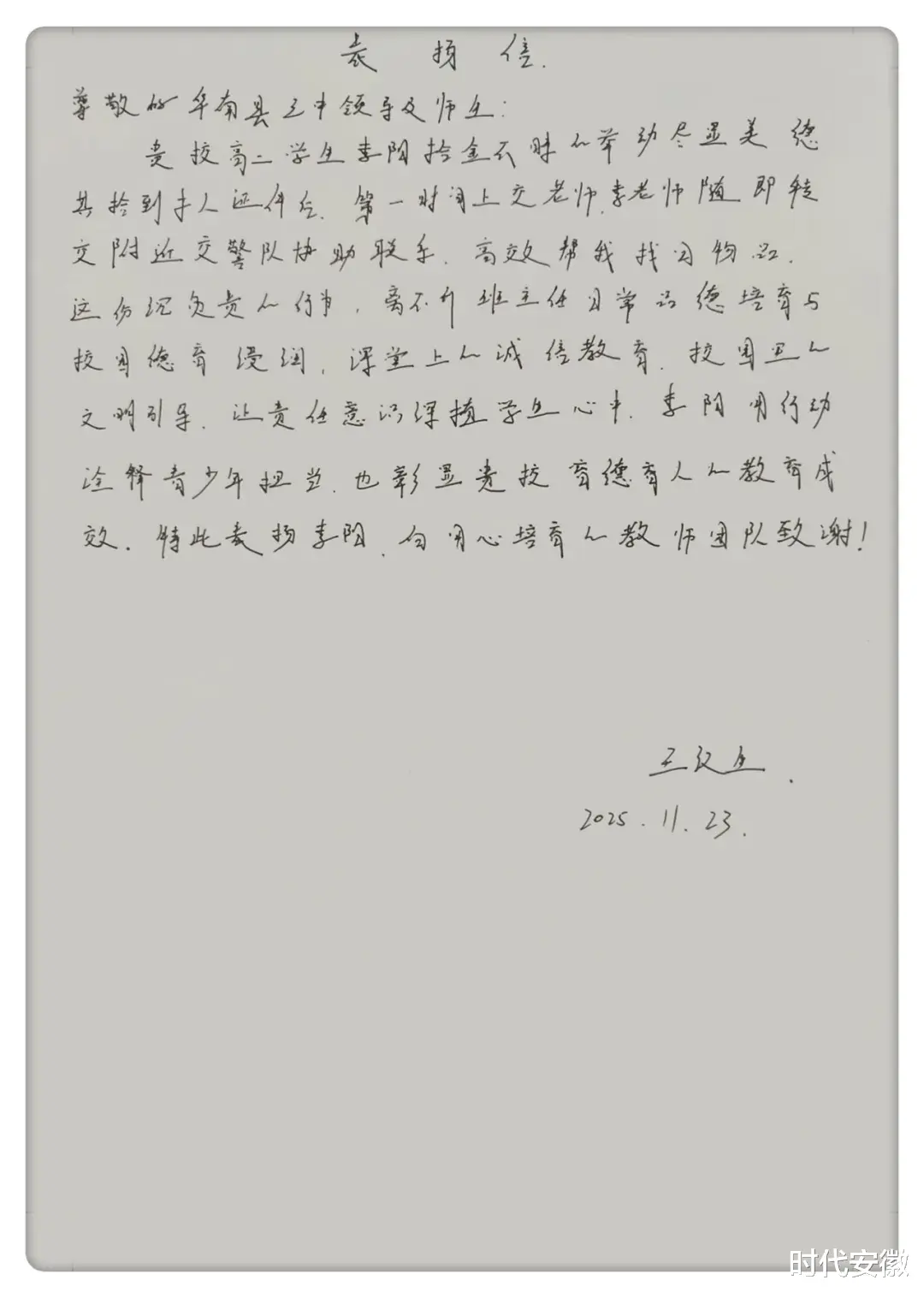 2025年11月17日中午,阜南三中高二(1)班学生李阳在放学途中,于校外拾到一个塑料袋,内装有机动车驾驶证、行驶证、多张银行卡等重要个人物品。想到失主可能正为此焦急万分,李阳同学毫不犹豫,第一时间将物品上交至班主任李军老师手中。李军老师接到物品后,意识到证件和银行卡对失主日常生活与出行至关重要,立即主动将失物送至城南派出所,希望借助警方力量尽快联系失主。派出所民警高度重视,迅速根据证件信息展开查找,并成功与失主取得联系。11月23日上午,失主专程从合肥来到阜南三中,当面对李阳同学与李军老师表达诚挚谢意,并亲手递交了一封情真意切的感谢信。失主激动地表示,这些证件和卡片一旦遗失将给生活带来极大不便,由衷感谢李阳同学拾金不昧的高尚品格,也感谢学校和老师的悉心教育。