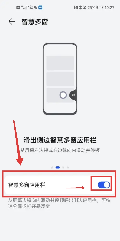 3.进入智慧多窗页面后,把【智慧多窗应用栏】后面的开关打开即可了。