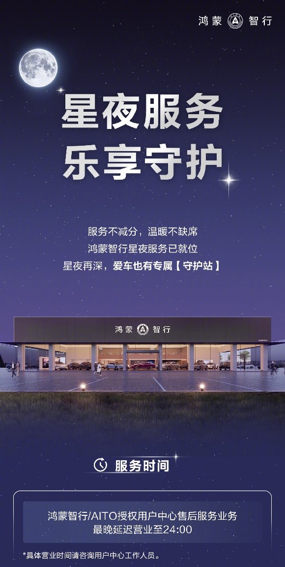 以往,车主常常面临“门店上班我上班,我下班了门店也下班”的尴尬维保困境。但鸿蒙智行新推出的星夜服务,完美解决了这一问题。从4月18日起,全国近200家用户中心推行星夜服务,常规营业时间延长至21点,核心城市旗舰店更是营业至24点,打造了行业最长的服务时间带。