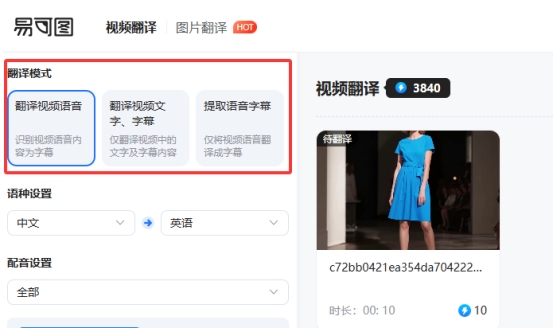 三种翻译方式可供选择:① 翻译视频的语音部分(AI智能识别人物对话,并翻译出 AI配音);② 翻译视频的文字字幕部分(只把视频画面里的文字/硬字幕翻译出来即可);③ 只翻译视频的语音部分,输出语音文件(适合后期想自己添加字幕的情况);