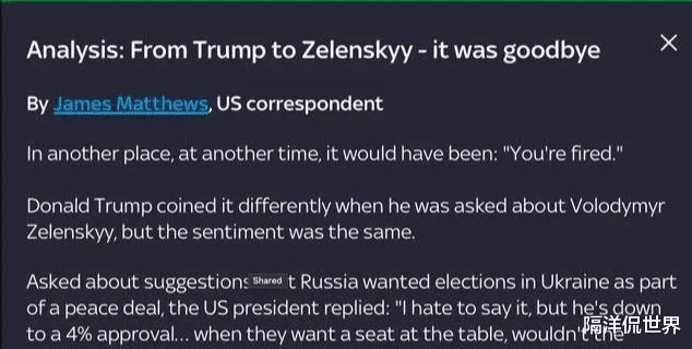 这是英国天空新闻驻美国记者马修对最新的事态进行分析时的标题:《特朗普对泽连斯基说再见》。