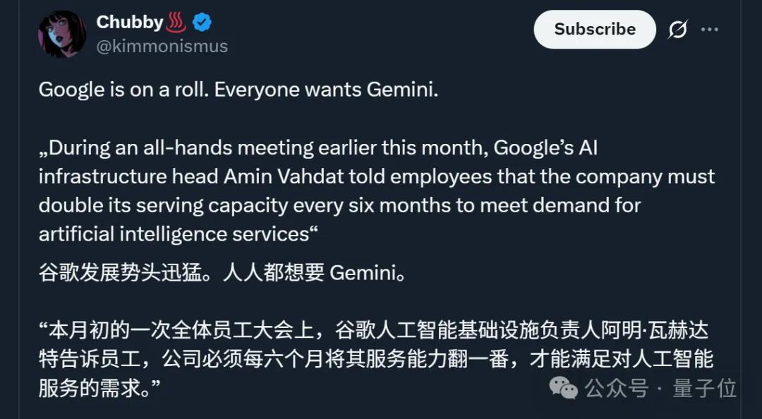 而且谷歌内部已经清楚,“公司必须每六个月将其服务能力翻一番,才能满足对AI服务的需求”。