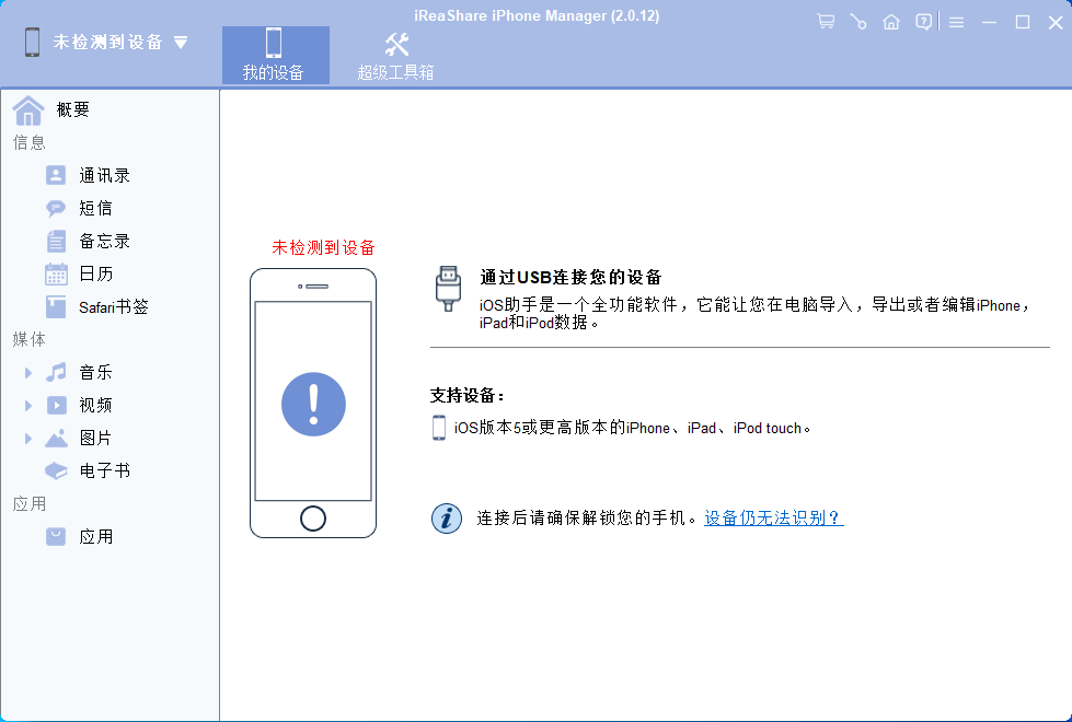步骤1:启动iReaShare iPhone Manager,并使用USB数据线将你的iPhone连接到电脑。在主界面顶部选择“超级工具箱”功能。