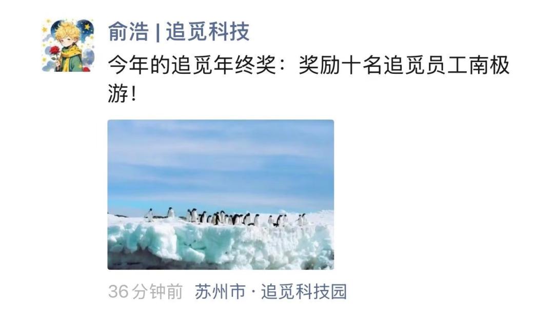 黄金福利只是追觅年末激励的开胃小菜,俞浩还在朋友圈高调宣布另一个超级福利——奖励10名员工专属南极游,让核心骨干在新春之际开启独一无二的极地探索之旅,用稀缺体验致敬优秀贡献。