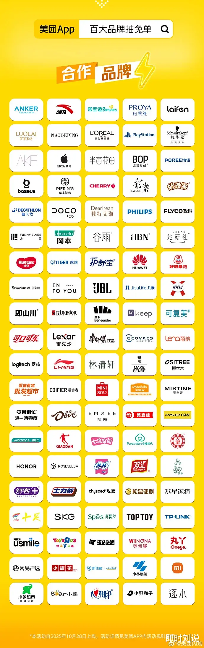 10月27日,美团闪购针对双11推出“百大品牌抽免单”活动,用户可通过美团APP搜索“百大品牌抽免单”进入活动页面,点击“立即抽免单券”参与抽奖,最高可抽取200元免单券,同时还有iPad、华为手环等商品券可供抽取。为了增加抽奖机会,用户完成指定任务还能额外获得抽免单次数,这种“任务+抽奖”的模式,将即时消费的互动性与福利发放结合,区别于传统电商的满减套路。