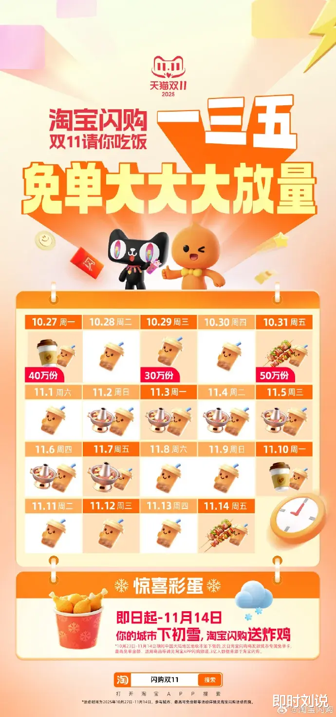淘宝闪购作为首次参与大促的业务,淘宝闪购于近日宣布升级其餐饮外卖优惠活动。平台表示,相关促销将持续至11月14日。本次活动主要包含两项新增举措:
