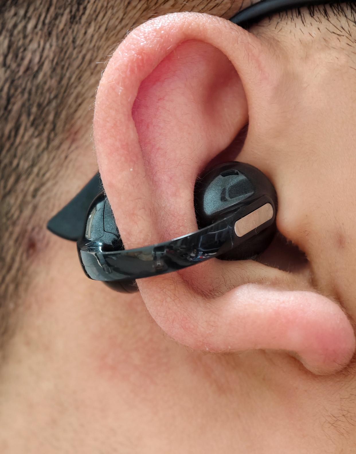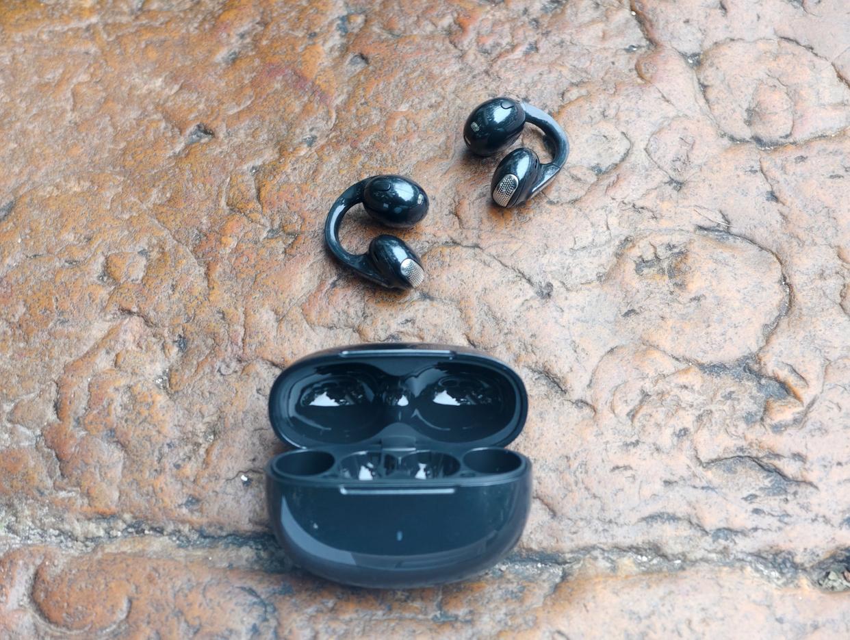 月影的机身是简约流线型,雅典黑的磨砂质感摸起来很舒服,不像亮面材质容易沾指纹。它的尺寸比普通耳夹式稍大,但重量控制得不错,单耳佩戴几乎没负重感,长时间戴也不坠耳~