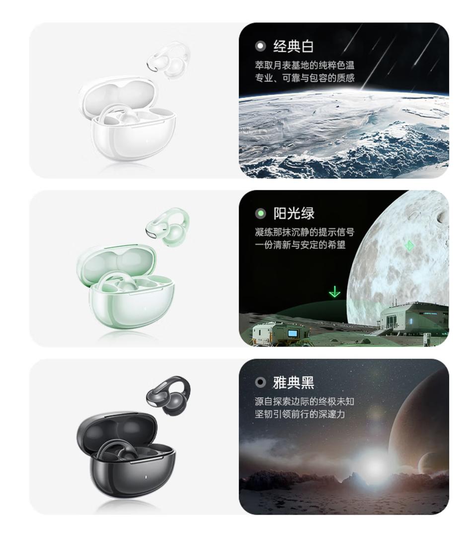 我特意戴它跑了 5 公里,耳机牢牢固定在耳朵上,没滑落也没摩擦耳道。体积控制得不错,戴在耳朵上不突兀,日常搭衣服很自然。经典白适合喜欢干净风格的朋友,阳光绿运动时戴亮眼有活力,三个配色覆盖不同场景需求~