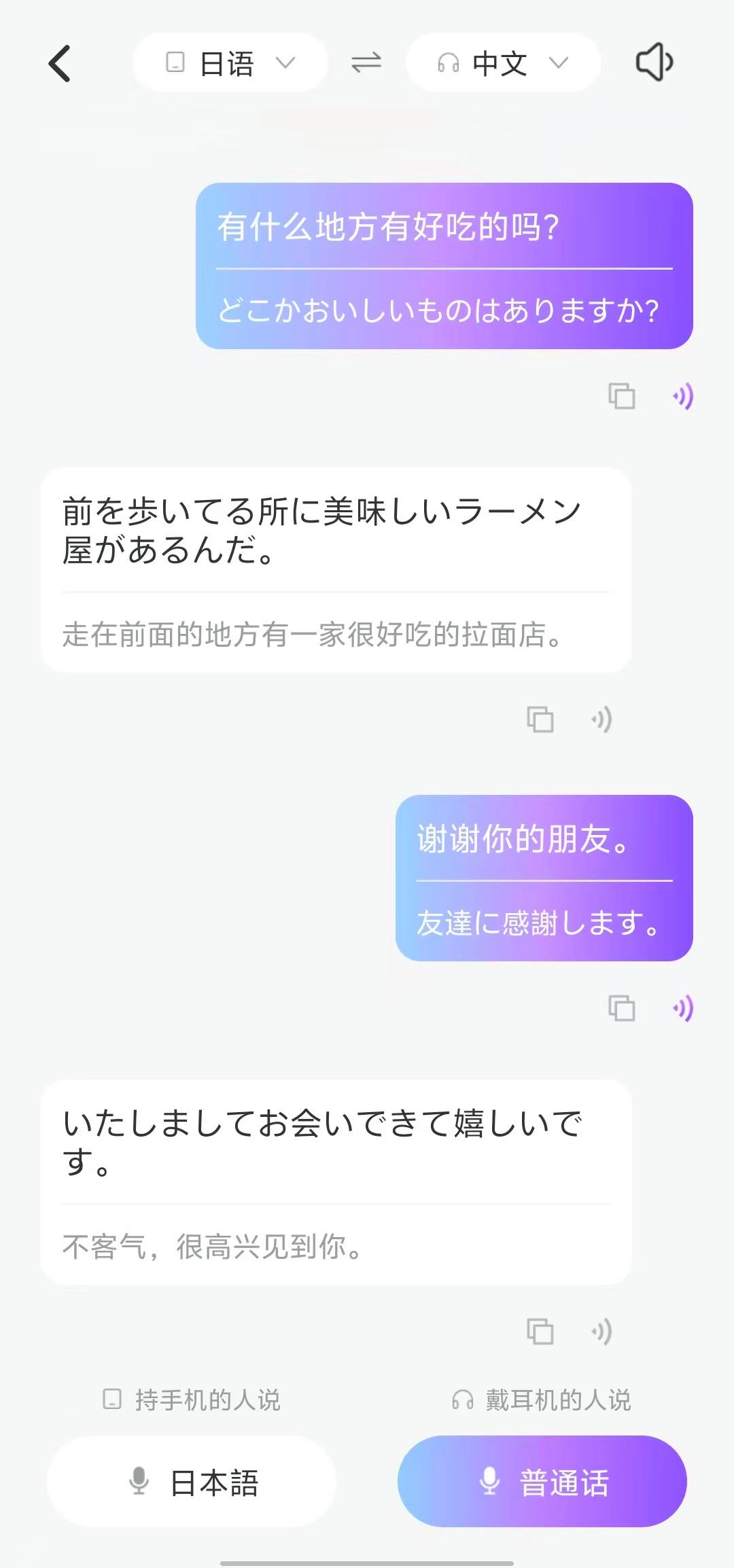 AI面对面互译也特别实用,国庆出国旅游时,遇到沟通障碍直接用面对面传译,对着耳机说话,APP 实时显示翻译结果,支持多种语言,反应快没延迟。问路、点餐、购物都能轻松应对,不用再靠手势比划~