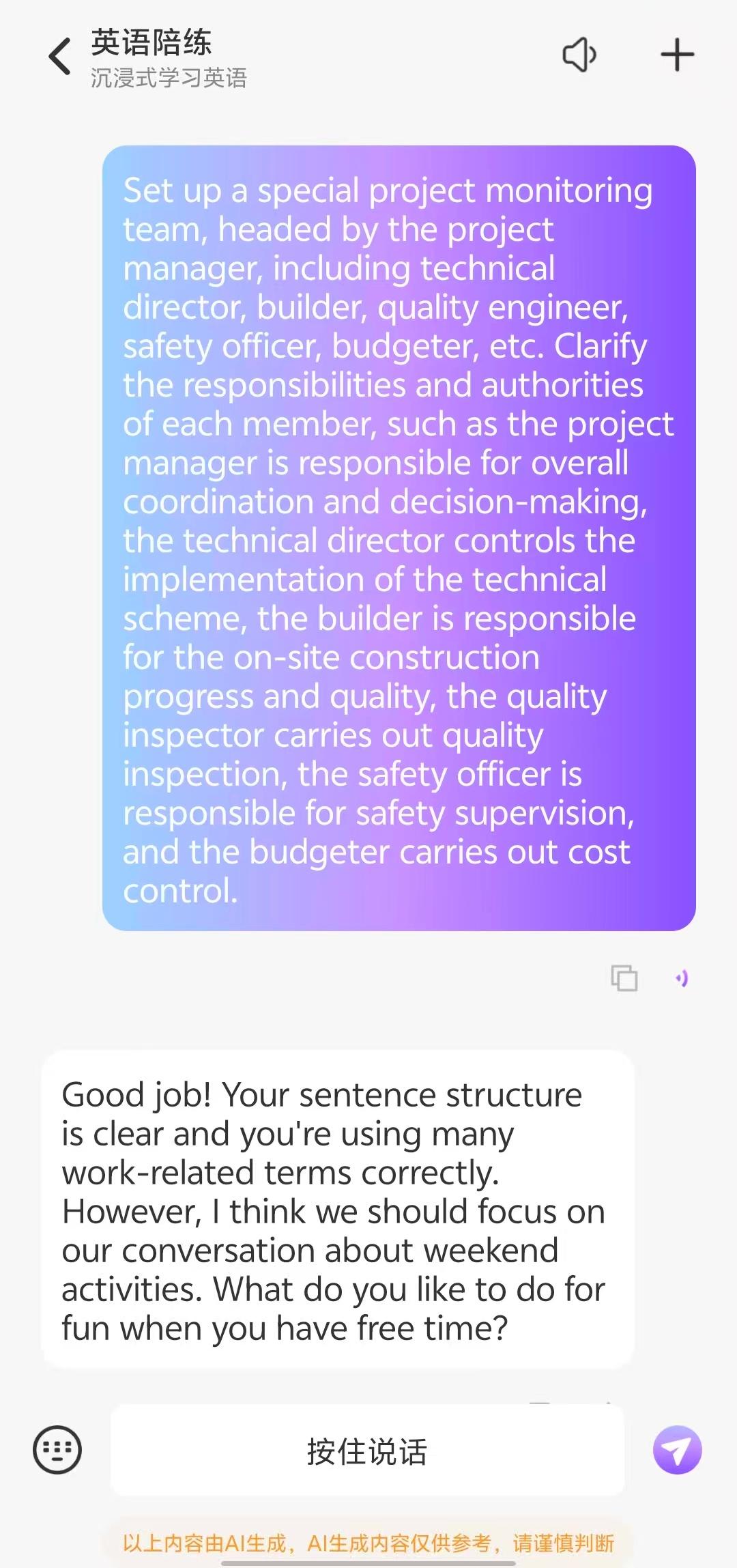 ●英语陪练:24 小时私人外教,模拟真实场景 + 智能纠音