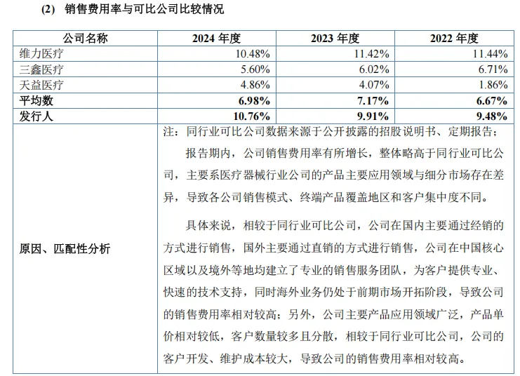针对销售费用率偏高的质疑,海圣医疗从业务模式与市场特性角度给出解释。公司指出,其销售网络布局与同行业存在明显差异:国内市场以经销为主,国外则依赖直销模式,这要求企业在核心区域及境外建立专业化销售服务团队,提供及时技术支持,由此推高了人力与运营成本。此外,公司产品应用领域广泛、单价较低且客户高度分散,相较于同行业竞品,客户开发与维护的难度更大,需投入更多资源用于市场拓展与关系维护。这些因素叠加,共同导致其销售费用率高于行业均值。
