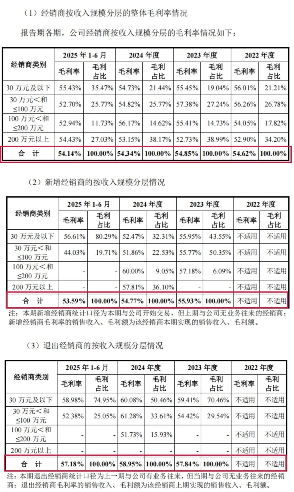 此外,经销商网络的高频变动与管理成效也受到质疑。过去两年,公司经销商数量呈现“大进大出”特征:2023年新增215家、退出191家,2024年新增277家、退出219家,稳定性明显不足。更值得关注的是,2023年-2025上半年,新增与退出经销商的毛利率与整体经销业务(约54%)存在显著差异——新增经销商毛利率分别为55.93%、54.77%、53.59%,退出经销商则达57.84%、58.95%、57.18%(2024年退出经销商毛利率较整体高出4个百分点)。公司解释称,变动源于业务扩张调整及清退低效合作方,毛利率差异则与产品结构、地域竞争或小规模经销商议价能力弱有关。但鉴于经销业务是公司核心收入来源(占比85%-90%),且在境外直销占比提升的背景下,其经销商管理体系的有效性及后续管理策略的调整成效,仍需进一步观察。