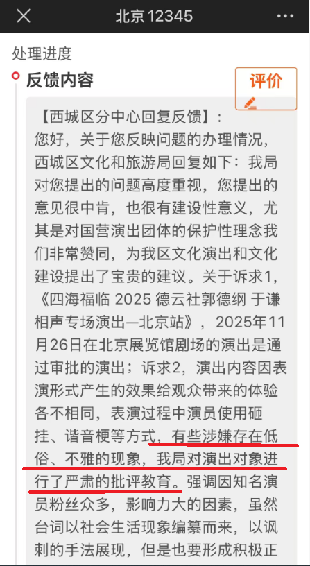 演出结束后,西城区文旅局的回复截图在网络传开,一位德云社老观众在网上评论:“这次老郭是真碰到红线了。”