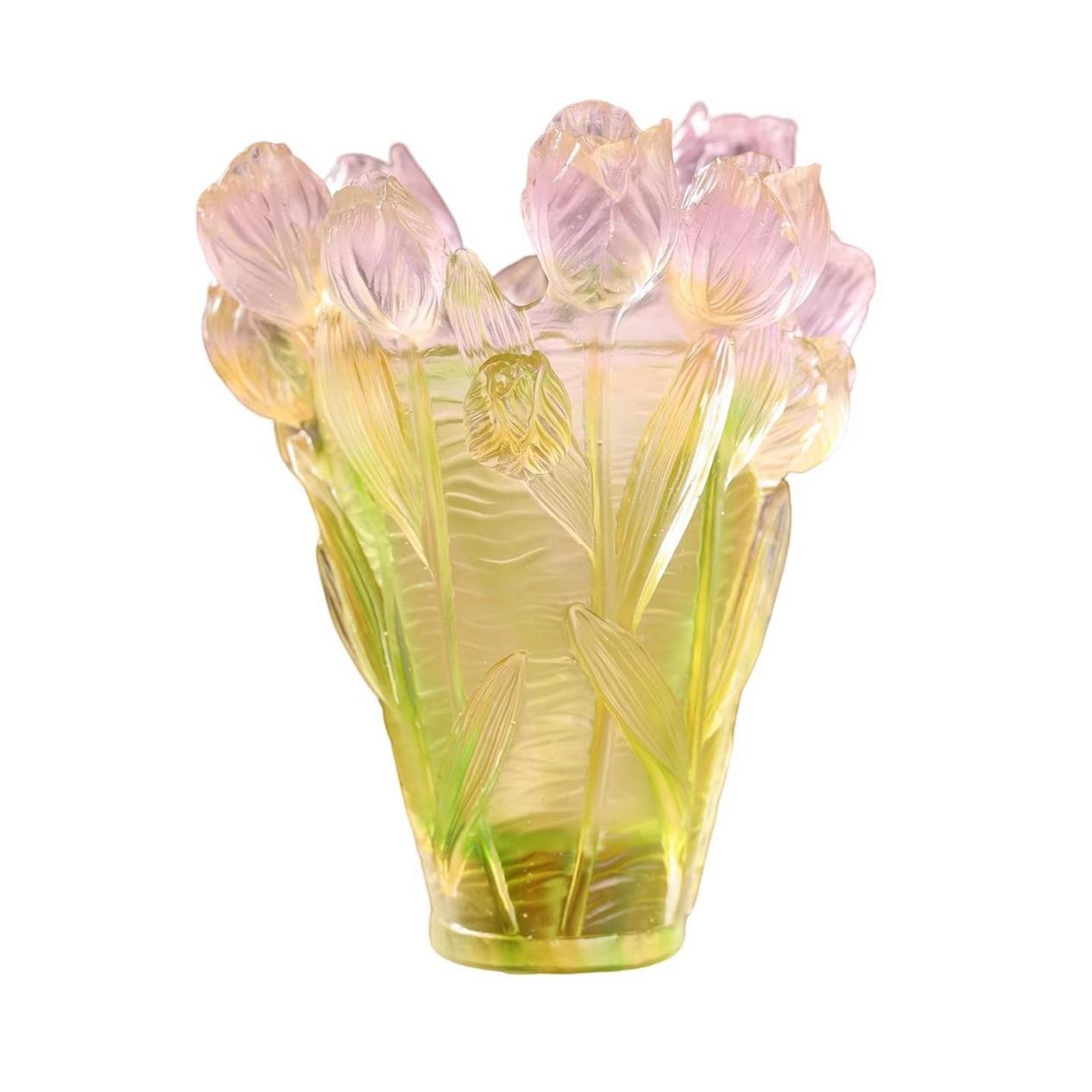 花瓶以郁金香为灵感,流畅的线条完美勾勒出花瓣的婀娜姿态 ,或舒张、或卷曲,自然灵动,仿佛能看到花朵在微风中轻轻摇曳。其色彩更是如梦如幻,似是将天边的晚霞、清晨的朝露都融入其中,从淡雅的浅粉到浓郁的嫣红,从澄澈的天蓝到清新的翠绿,每一抹色彩都带着琉璃特有的温润质感,在光线下折射出迷人的光晕,美得摄人心魄,让人不禁感叹,世间竟有如此美妙的造物。