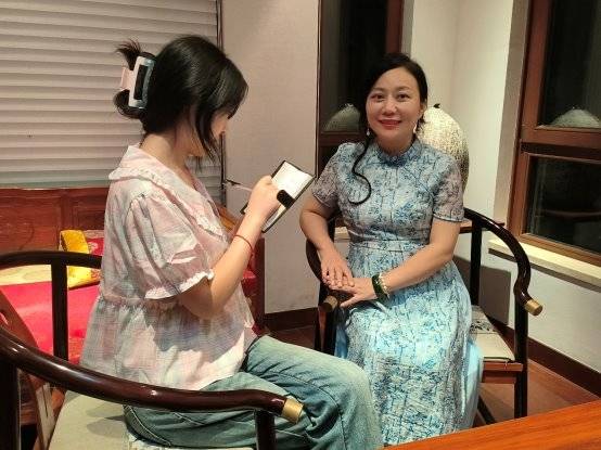 国画艺术家邓学梅接受采访(右)