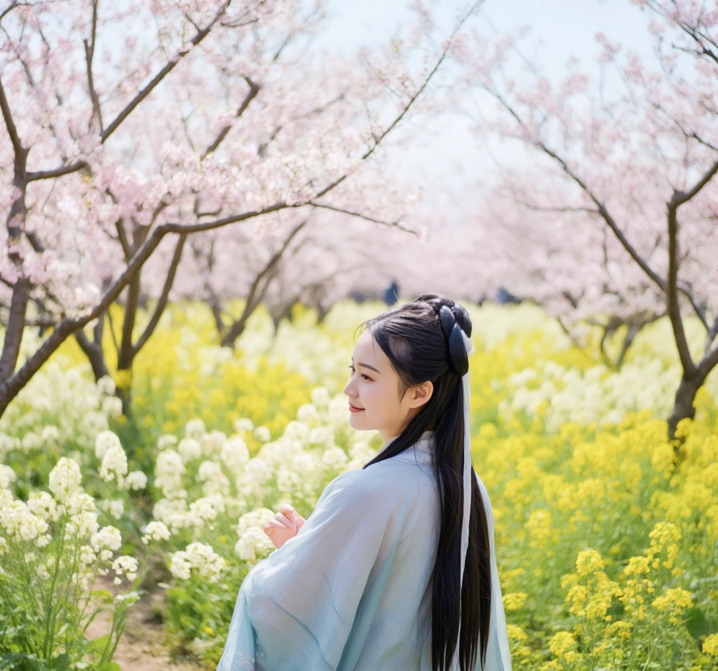 汉服少女在花海中留下唯美剪影,笑颜与花香共醉春风,仿佛一幅古典与现代交织的画卷,让人感受到春日的温馨与美好。