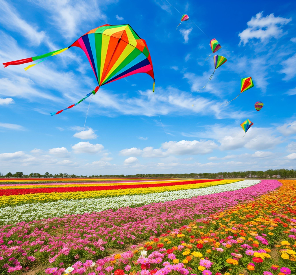 五彩风筝翱翔蓝天,与地面花海形成立体春日图景,为赏花之旅增添了几分趣味和活力。