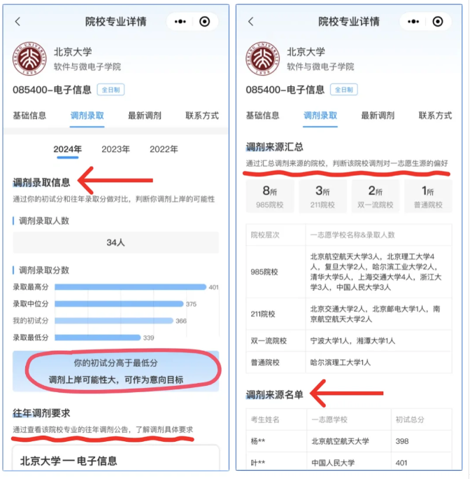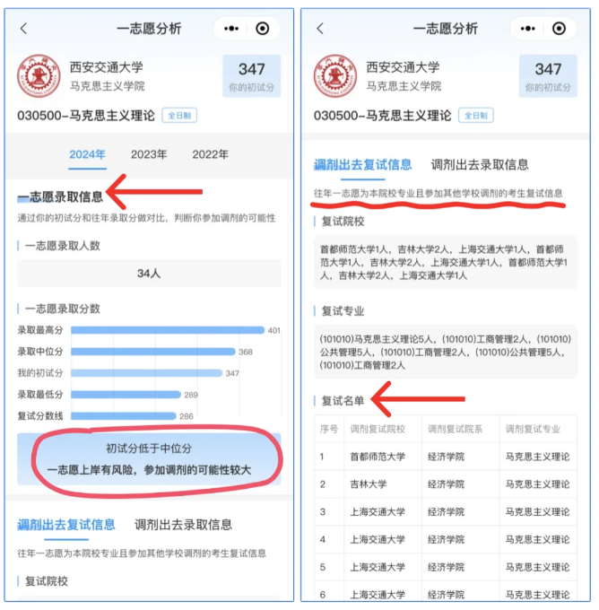 一方面,它会将你的初试分数与往年一志愿录取分数做对比,直观呈现你一志愿上岸的可能性 ——如果分数远超往年录取中位分,可安心准备一志愿复试;若分数处于“危险边缘”,则会提醒你提前启动调剂准备,避免错失机会。另一方面,它能帮你找到和一志愿相同的学长学姐,清晰展示他们调剂复试、调剂录取的院校专业。这些经过真实验证的“调剂去向”,都是你后续调剂的重点参考目标,比盲目搜索的信息更具参考价值。