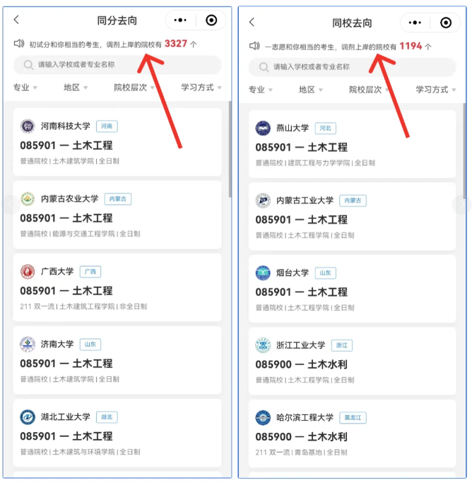 同校去向:汇总和你一志愿学校相同的考生调剂轨迹,让你了解 “同校战友”都去了哪些院校,为自己的调剂选择提供更贴近自身情况的参考。