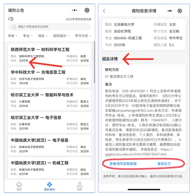 调剂阶段,“时效性”决定成败。研加加调剂小程序的“最新调剂信息”板块,让你不再错过任何关键消息。这里不仅收录了往年院校公布的调剂公告,作为参考依据;今年的调剂信息更是通过多渠道获取,实时更新同步——无论是院校发布的调剂名额公告,还是调剂要求调整,你都能第一时间知晓。