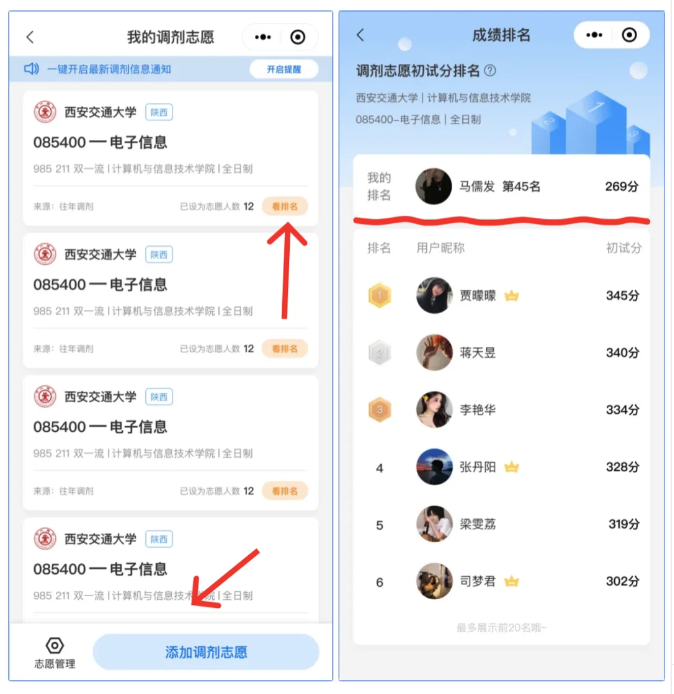 二是调剂志愿排名:当你选定意向院校专业作为调剂志愿后,可开通消息提醒,系统会实时推送该院校调剂信息的更新动态;更关键的是,它支持查看你在该调剂志愿中的成绩排名,以及其他考生的分数情况。通过排名对比,你能更清晰地判断自己的竞争力,进一步评估调剂上岸概率,让填报决策更理性。