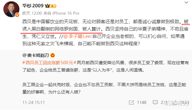 11月25日,华与华合伙人之一华杉发博:“西贝是中国餐饮天花板,被诱入黑白颠倒的网络罗刹国,被人算计……”
