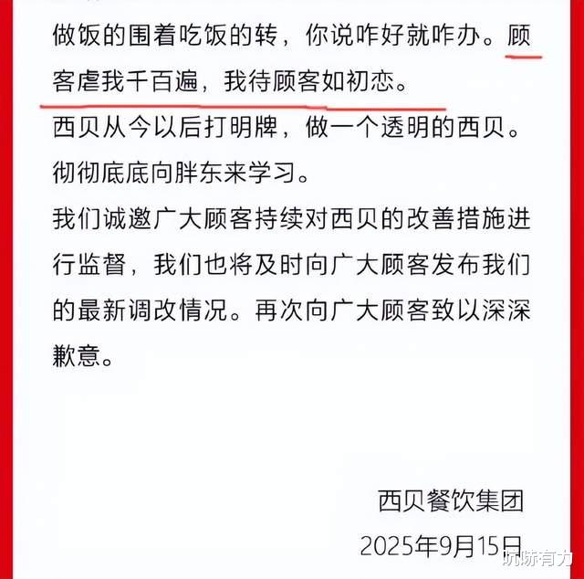 西贝道歉信中一句“顾客虐我千百遍,我待顾客如初恋”,直接把消费者整懵了:“合着我们维权是施虐?”
