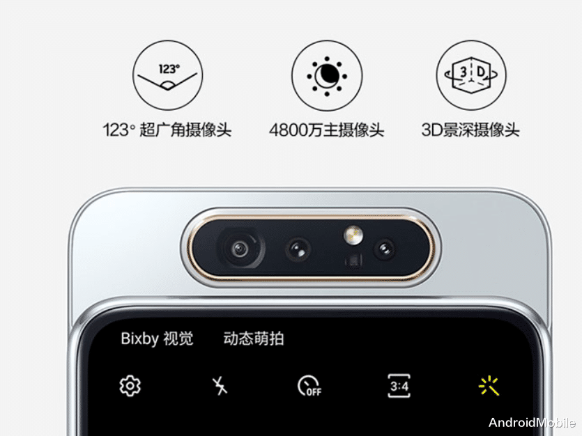 不同于其他非异形屏所采用的升降式摄像头,三星A80采用了180°的可翻转三摄,这也就同时保证了无论是自拍还是用来拍物体,都是4800W的大像素。