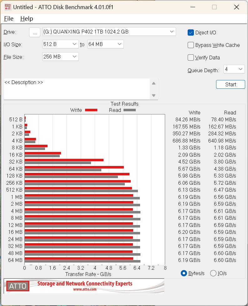 在ATTO的测试之中,表现比较稳定,数据读写速度从32KB时就开始增加,后续的读取稳定在了6.6GB/s左右,写入稳定在了6.2GB/s左右,日常大量文件拷贝性能表现稳定。