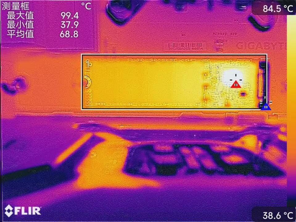 裸盘测试满载温度比较高,主控局部达到了99℃,不过并未出现降速显像,但还是建议日常搭配马甲使用,可以一定程度上延长使用寿命。