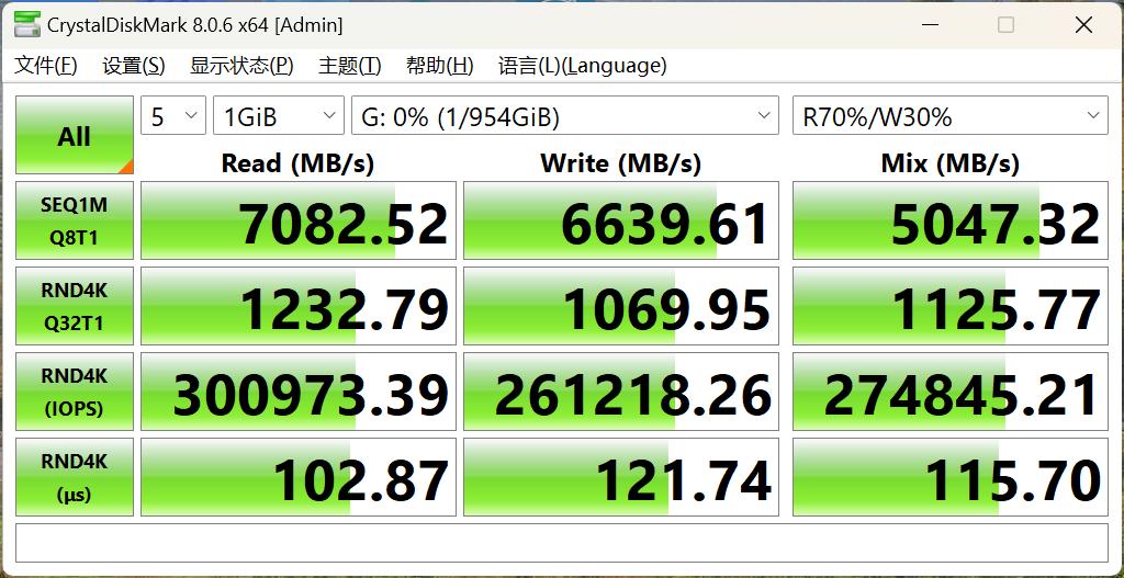 CrystalDiskMark8实测读取速度7082.52MB/s,写入速度6639.61MB/s,R70%/W30%混合读写5047.32MB/s,写入表现比官方标注的略高一些,这个性能表现还是不错的,符合目前旗舰级高速PCIe4.0盘的定位。