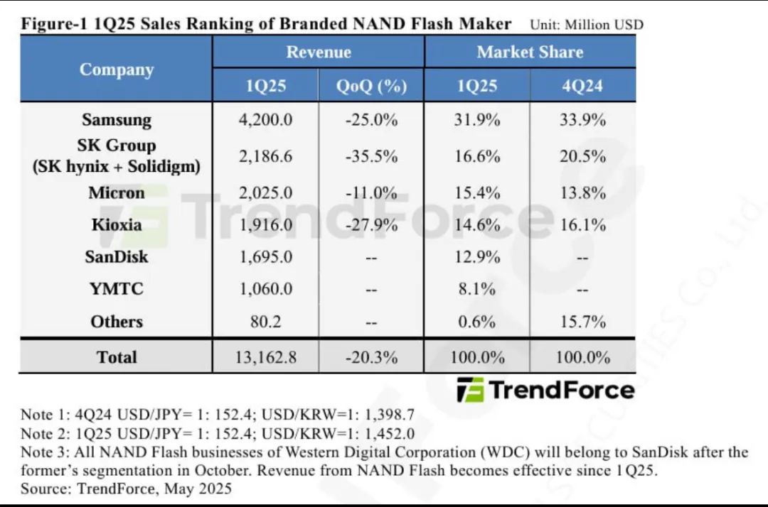 在 2025 年第一季度,全球存储市场中国的长鑫存储(CXMT)与长江存储(YMTC)季度营收均突破 10 亿美元大关。