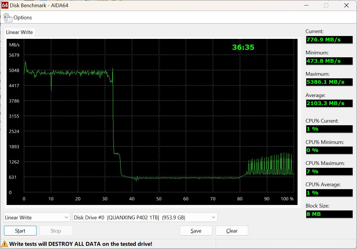 AIDA64全盘写入测试,可以看到在34%左右位置降速,缓内空间大概340G,缓外速度降低至500MB/s,日常办公、游戏场景完全可以胜任。