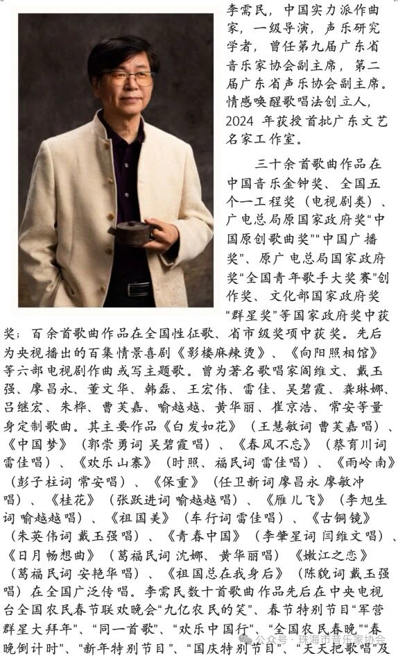 著名作曲家李需民先生,是我国颇具影响力的实力派作曲家、一级导演、声乐研究学者,曾任第九届广东省音乐家协会副主席、第二届广东省声乐协会副主席,曾获广东省优秀音乐家突出贡献奖,并于2024年获授“广东文艺名家李需民工作室”。其创作成果丰硕,有三十余首作品荣获国家级及省级政府奖项,代表作包括《白发如花》、《中国梦》、《春风不忘》、《欢乐山寨》、《好上加好》等。