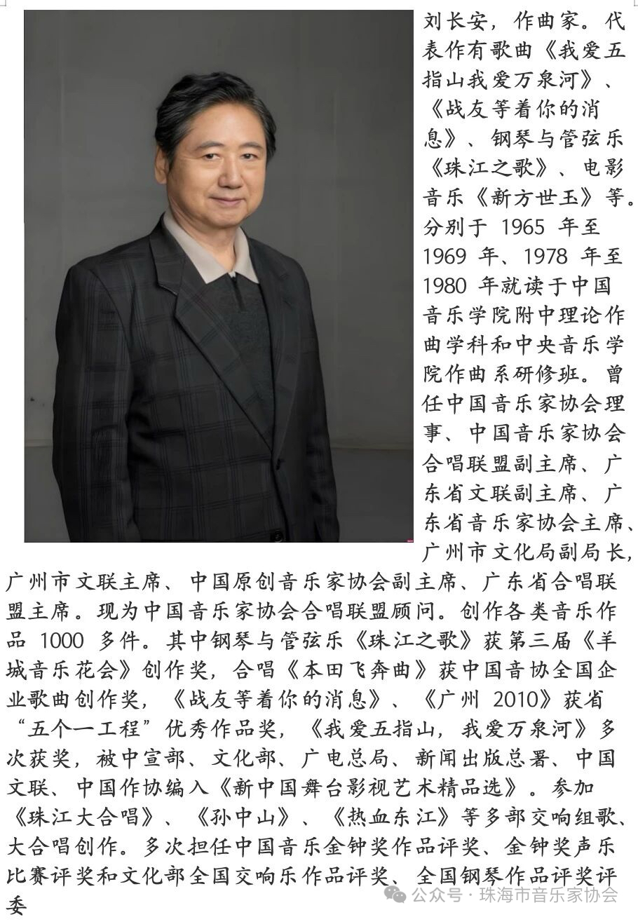 著名作曲家刘长安先生,曾任广东省文联副主席、广东省音乐家协会主席,其代表作《我爱五指山,我爱万泉河》家喻户晓,屡获殊荣,被收录于《新中国舞台影视艺术精品选》,成为经久不衰的时代金曲。他的创作领域广泛,还涉及《战友等着你的消息》、钢琴与管弦乐《珠江之歌》、电影音乐《新方世玉》等众多作品。