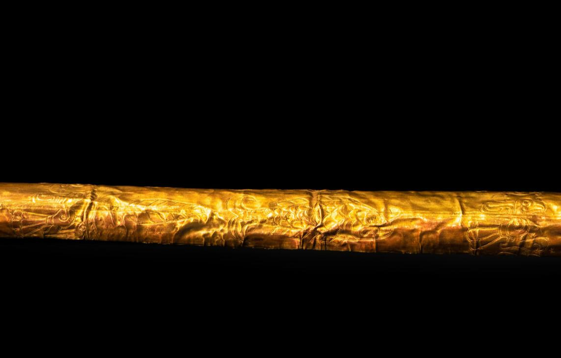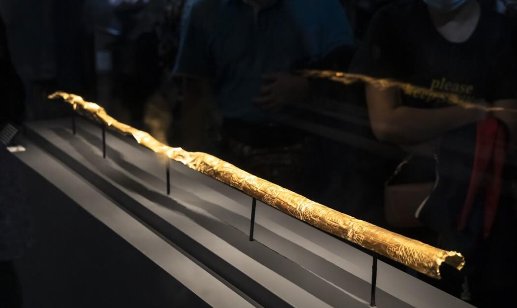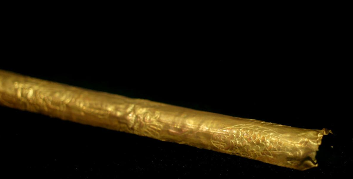 金杖与青铜雕像,也许是三星堆出土文物中最引人注目的稀世珍宝了。这柄金杖是用较厚的纯金皮包卷而成的金皮木芯杖,杖长142厘米,直径2.3 厘米,净重 500 克。杖的上端有一段长 46 厘米的平雕纹饰图案,分为3组:靠近端头的一组。合拢看为两个前后对称,头戴五齿巫冠,耳饰三角形耳坠的人头像,笑容可掬。另外两组图案相同,其上下方分别皆是两背相对的鸟与鱼,在鸟的颈部和鱼的头部叠压着一支箭状物。