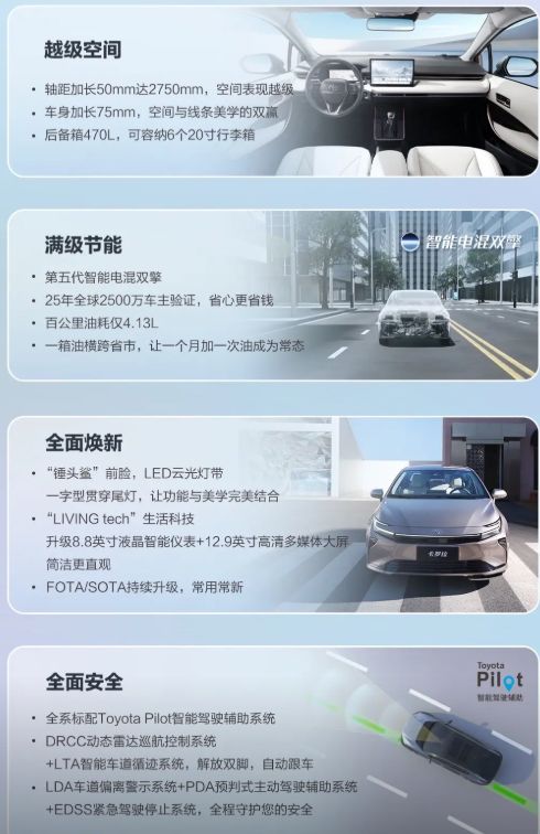 ▲一汽丰田发布改款新丰田卡罗拉。在一汽丰田之夜活动中,一汽丰田带来全新改款的丰田卡罗拉,作为第13代大改款来临前的过渡期,新改款卡罗拉不仅外型更帅,空间更是有感放大直逼凯美瑞,并搭载汽油、油电双动力。▲一汽丰田发布改款新丰田卡罗拉。 ▲车头大整容换上醒目的C字型头灯组,与家族作呼应。日前日本东京车展已经出现全新丰田卡罗拉概念车,为第13代大改款埋下伏笔,不过为了强化卡罗拉竞争力,率先在今年发起新改款,也是作为12代与13代衔接的过渡期。外观方面,车头可是大整容不少,换上丰田最新家族风格,前脸采用类「锤头鲨」造型,全新灯组与下方的进气口融为一体,视觉风格更加简洁。 也能与卡罗拉 Cross、凯美瑞等新生代家族作呼应。一汽丰田发布改款新丰田卡罗拉。 轴距放大50mm,能带来更好的空间规划。车侧线条更有轿跑风,腰线一路从头灯延伸至尾部。 车身尺码来到 4710×1780×1435mm,轴距则为2750mm,比现款足足多了 50mm,能发挥理想的车室空间,轴距增加有感直逼凯美瑞的2825mm轴距。 车尾设计与车头相呼应,采用时下流行的贯穿式尾灯组。一汽丰田发布改款新丰田卡罗拉。 动力维持双动力配置。内装配备12.9寸中控屏幕 与8.8寸仪表,搭配三幅式方向盘,营造更浓厚的科技氛围。 官方也强调这次提供双色车室设计,让新车看起来更具年轻化风格。在安全与辅助驾驶方面,新车全车系皆标配丰田Pilot智能驾驶辅助系统,同时具备疲劳驾驶监测、LDA 车道偏离警示、PDA 主动驾驶辅助、EDSS 紧急驾驶停止等多项科技功能。动力有2.0升自然进气、1.8升油电两种动力,其中油电已升级第5代THS技术,4.3L平均油耗,新车正式上市预计在今年12月。