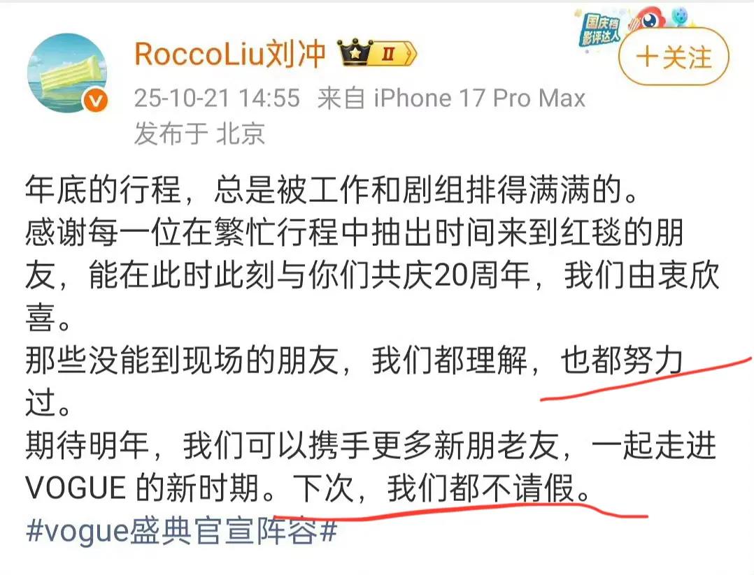 但今年VOGUE二十周年盛典,赵丽颖、迪丽热巴、杨紫、肖战、王一博、辛芷蕾等重量级内娱大咖全以各种理由请假,愣是一个没来,把刘冲都急得发文呼吁“下次不要请假”。