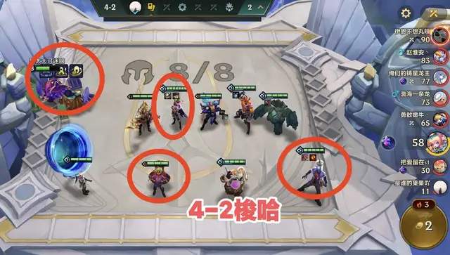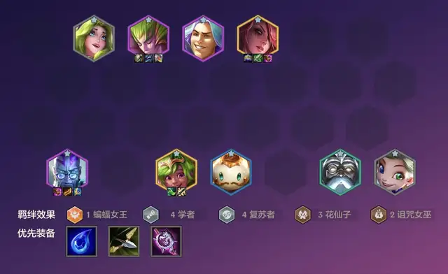 8人口如果有女巫可以下掉莉莉娅,这里柯妹忘记留莉莉娅了,所以就用了慎打工,开4复苏4学者,其余在根据羁绊搭配即可。