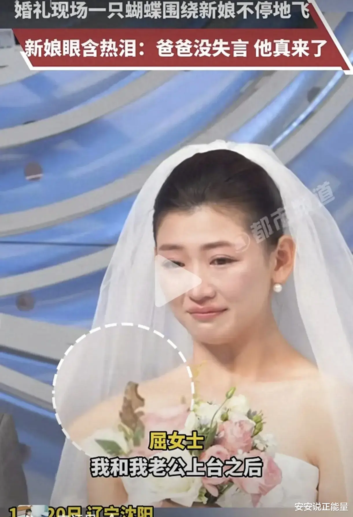 新娘表示,她觉得是去世的父亲化身蝴蝶来参加她的婚礼了。因为现在沈阳都已经是零下温度的冬天了,婚礼现场又是在二楼,还是门窗禁闭状态,她们根本不知道这只蝴蝶到底是怎么飞进来的。