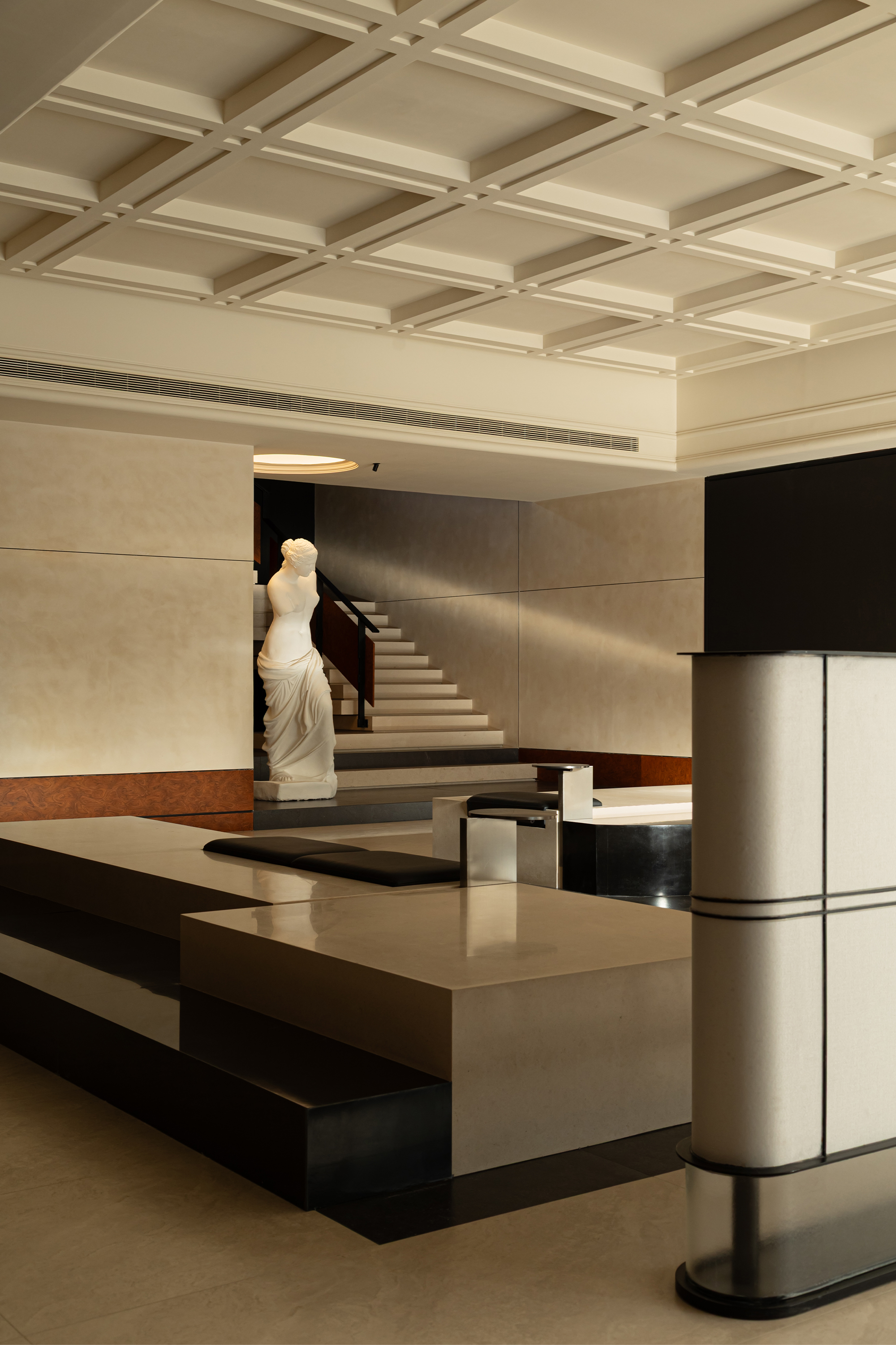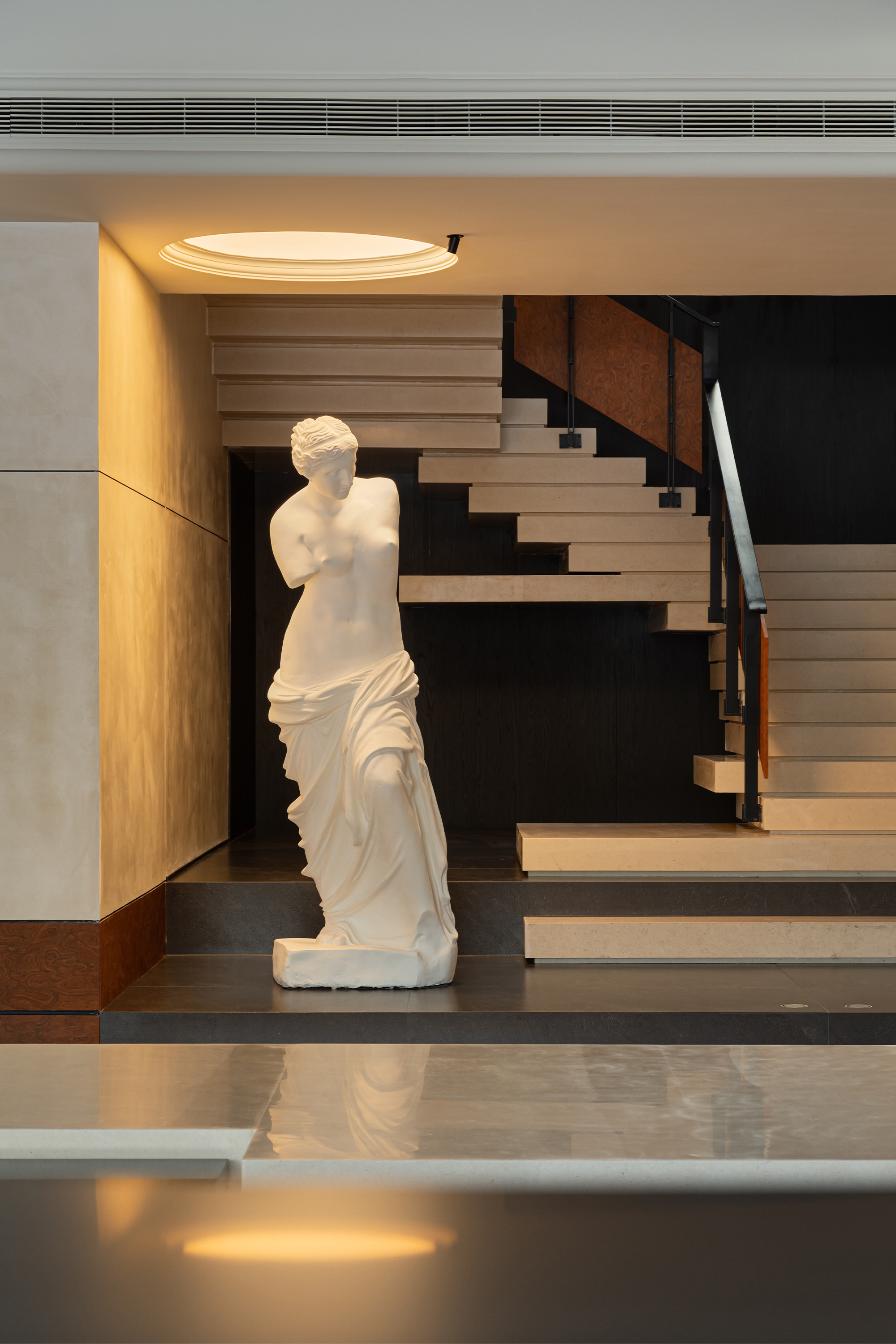 美学亿伽设计和您一起赏析BORNDORE SPA设计,黑色皮凳与米白大理石台面,构成低奢松弛的初印象。视线尽头,维纳斯雕