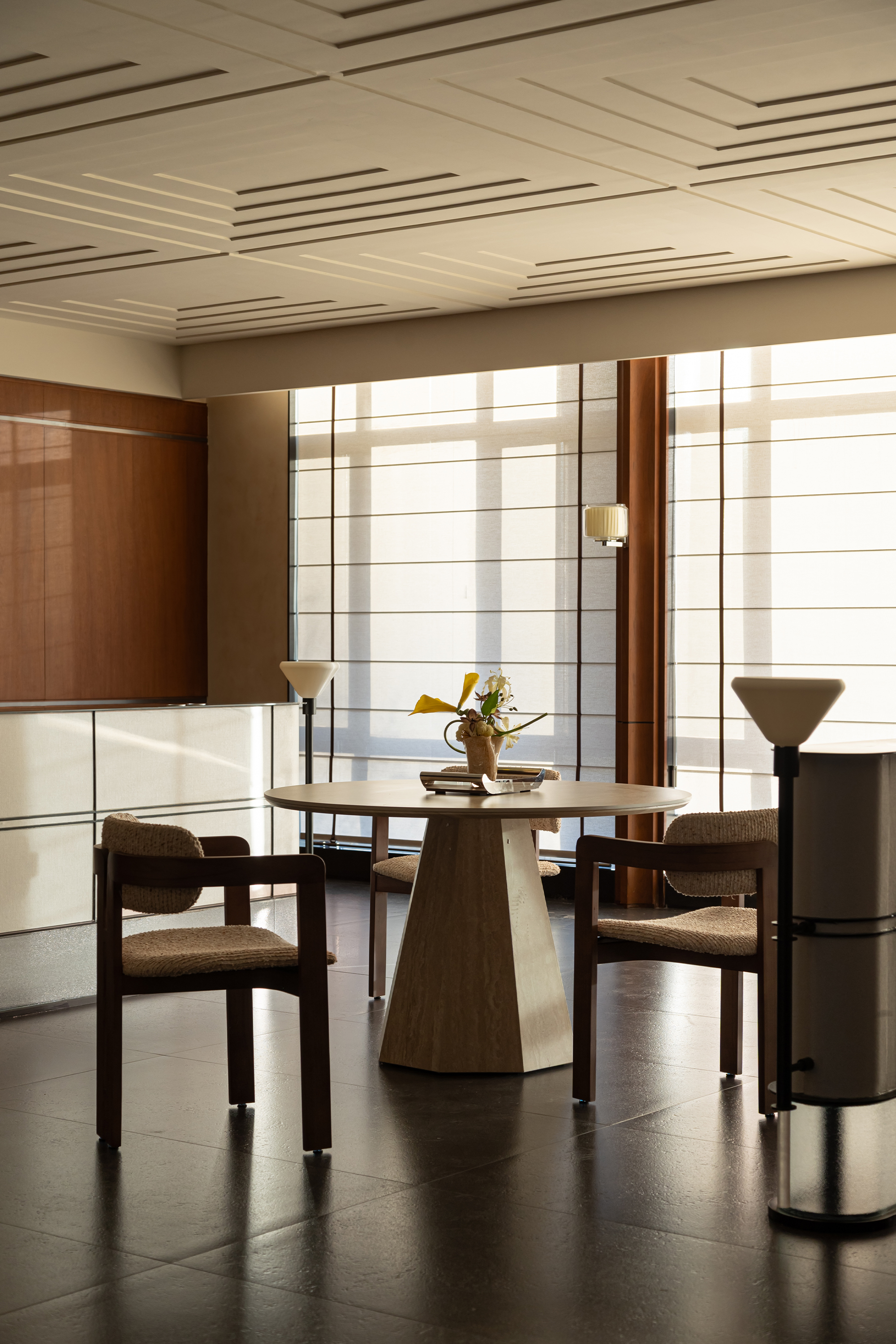 衔接上下的楼梯,以石材踏步与木纹护栏相融,黑色金属框线利落勾勒,将垂直通行化为美学氛围的自然过渡。餐食区,格栅吊顶与木纹墙面温润相拥,黑白软包隔断围出半私密空间;圆桌织椅消弭距离感,暖光花艺添柔。