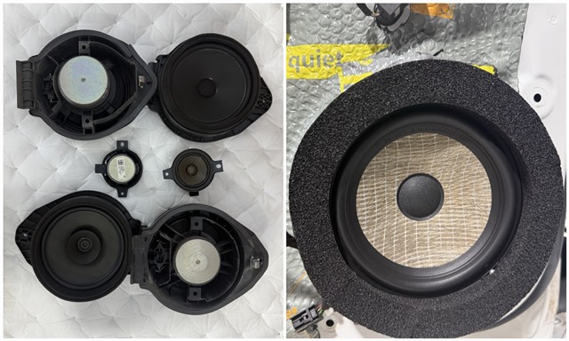 施工前,师傅对车内饰进行了全面保护,避免在操作过程中划伤或污染内饰部件。并且把原车喇叭拆卸下来,可以看到原装喇叭没有任何保护措施,其背部已经微微泛黄,我们用劲浪中低音单元替换原车门喇叭后在前后声场的喇叭均加装防水垫圈,避免水分侵蚀。原车喇叭与劲浪喇叭的对比清晰可见——后者材质和工艺明显更优。