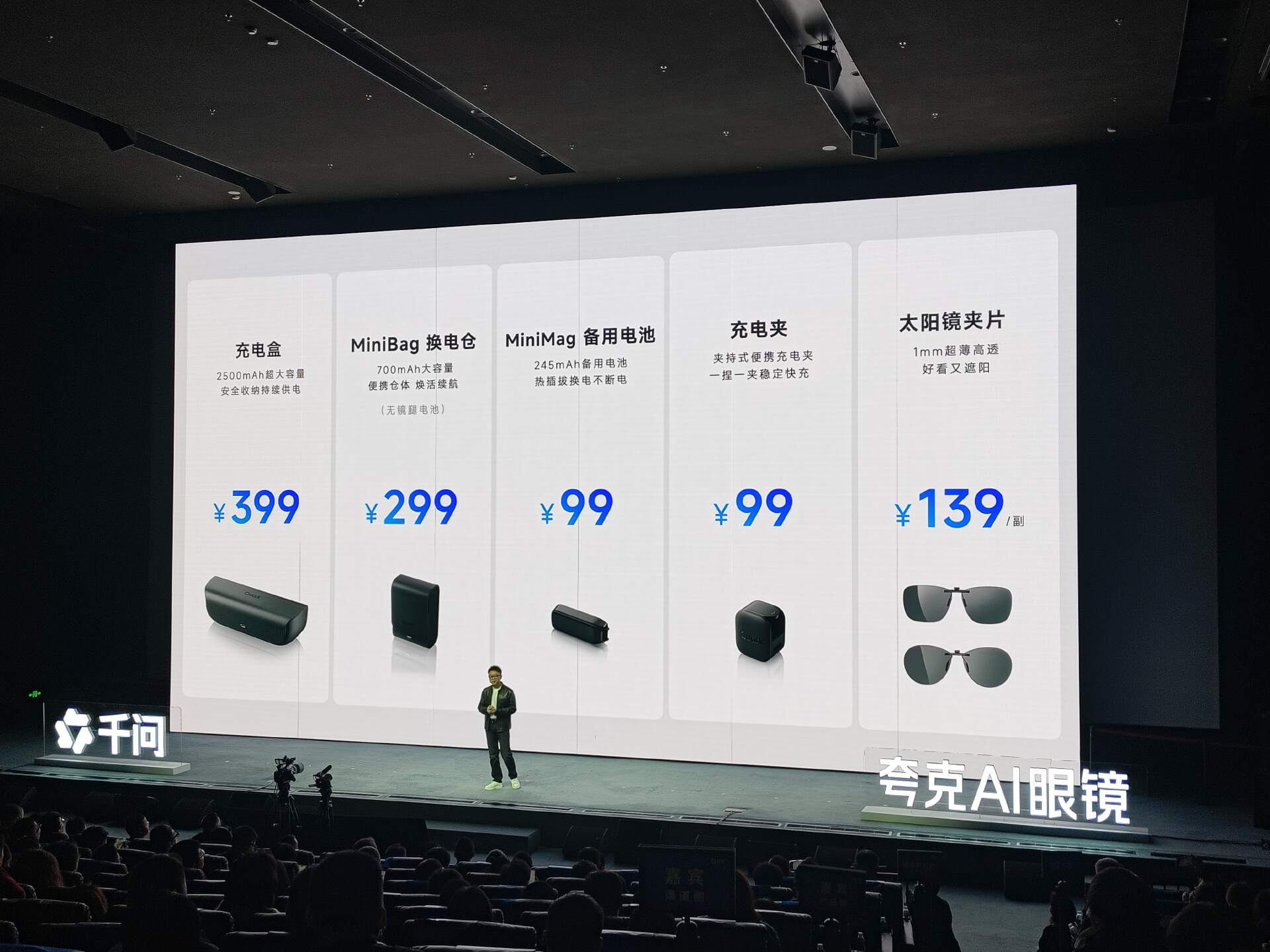 除了强调适配亚洲人头型、佩戴舒适之外,夸克AI眼镜的另一个卖点是续航,即在双电池系统的基础上增加换电设计,通过热插拔镜腿快速更换主电池,额外搭配可随身携带的换电仓,单品售价299元。此外,充电盒、备用电池、充电夹的售价分别为399元、99元、99元。