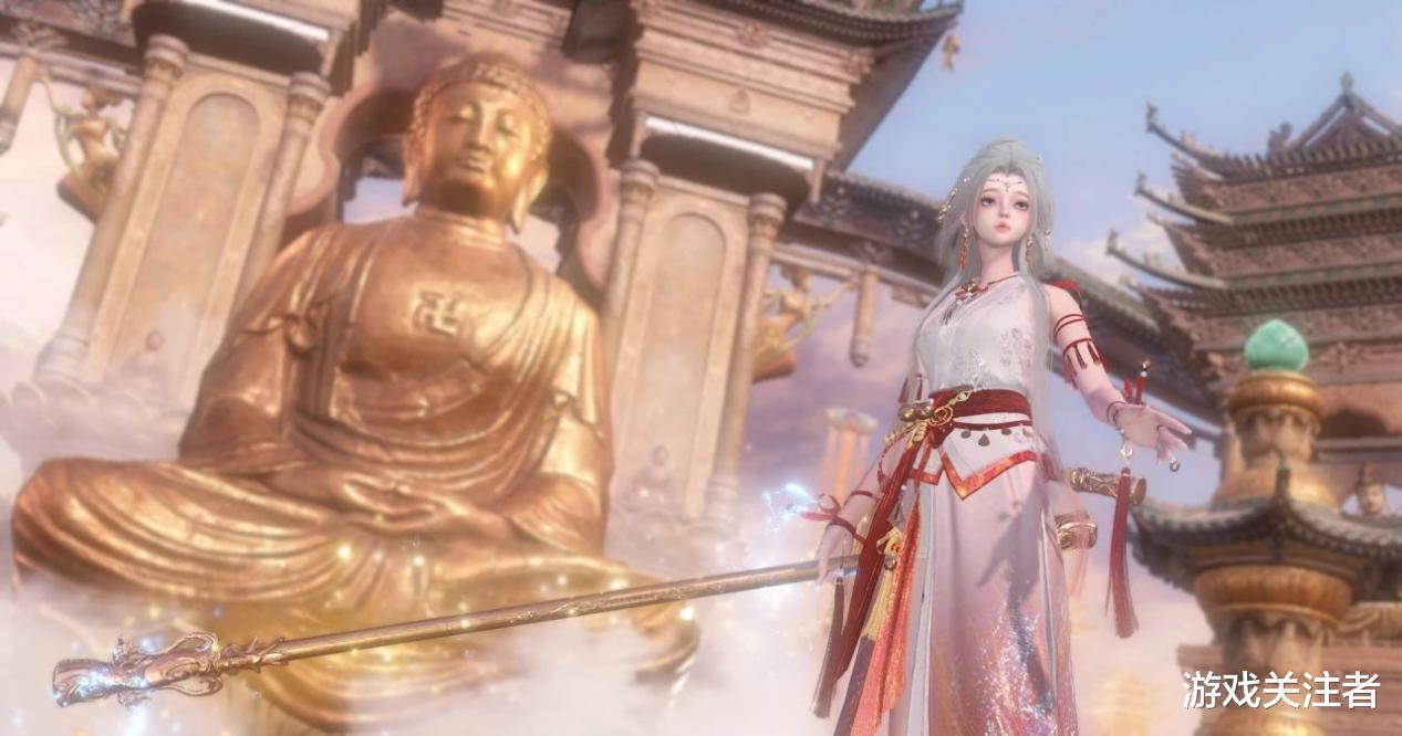 小西天中,一座巨大的金色佛像庄重端坐,佛面严肃,双目微闭,仿佛在俯瞰世间万象。此时,玩家们身着新时装登场,英挺的身姿透出一股孤傲与潇洒!绝美的容颜更如同仙女一般~天庭美景,必须打卡!