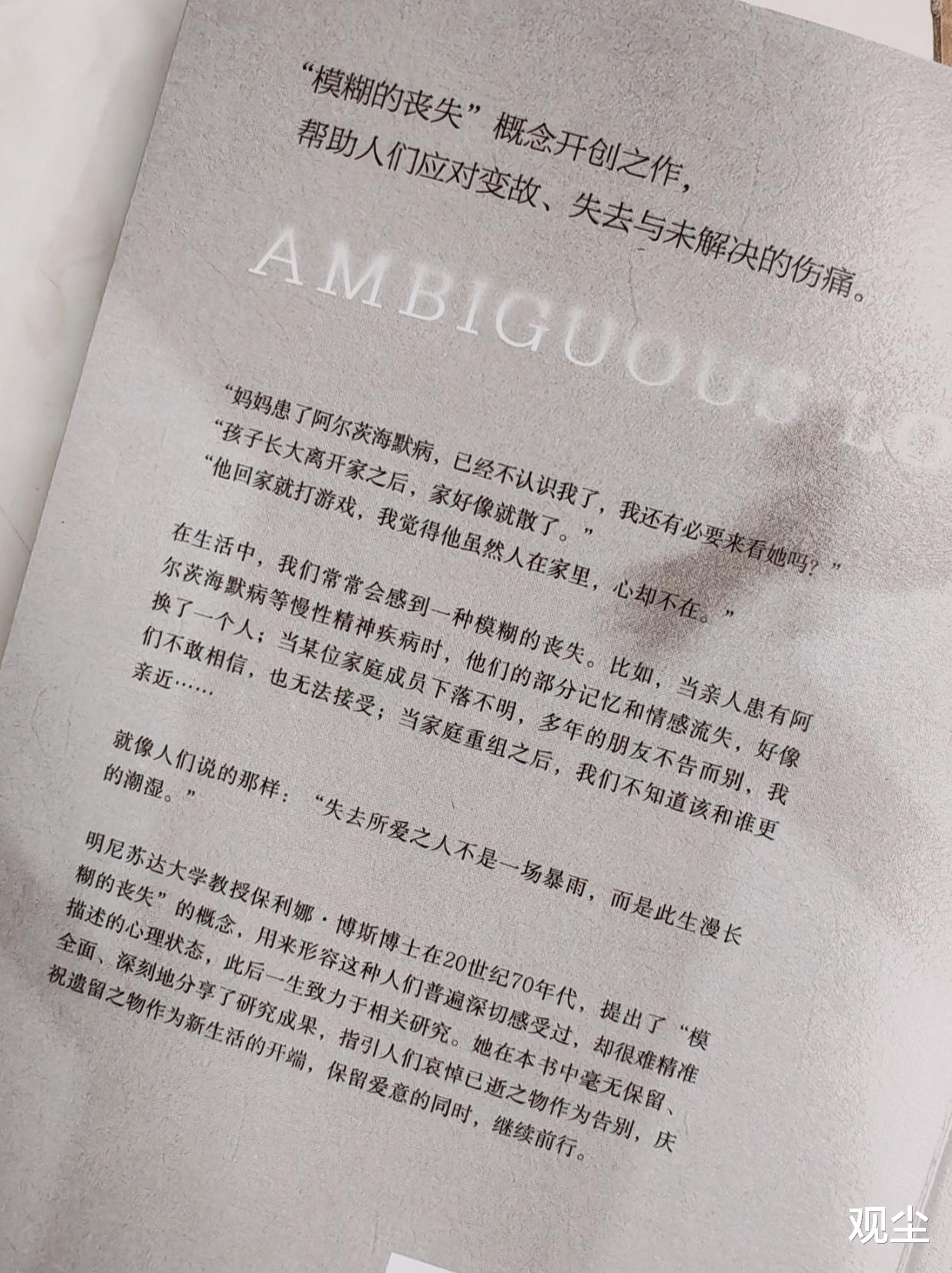 她花了40年的时间研究这种“没有句号的失去”。她在《模糊的丧失》一书中指出,在人际关系所面临的所有丧失中,模糊的丧失是最具破坏性的,因为这种丧失始终都是不确定、不明晰的,可以说是无法化解的悲伤。