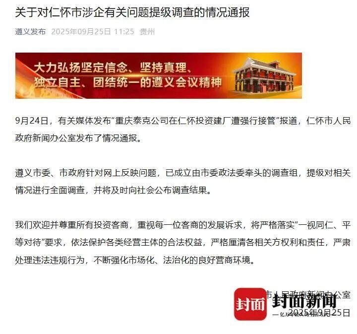 接管事件发生后,引发舆论关注。2025年9月25日,遵义市表示提级调查此事。目前,调查仍在进行中。