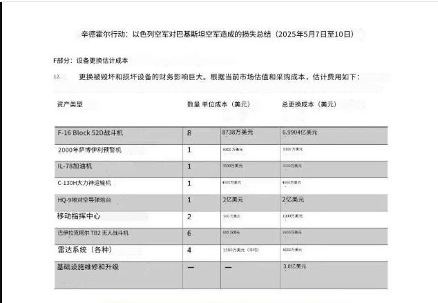 印度智库报告:“在朱砂行动,印度空军对巴基斯坦空军造成的损失总结(2025年5月7日至10日)战路与作战影响评估,印度空军中校萨蒂亚姆·库什瓦哈牵头撰写”,“本报告对巴基斯坦空军在2025年5月7日至10日,巴基斯坦空军在朱砂行动期间,遭受的战略和作战损失进行了全面、独立的评估。利用实时情报、监视和侦察验证、交叉验证的媒体报道,分析巴基斯坦空军的总损失,进行了可信的估计。”,“对巴基斯坦的预计财务影响总额:约76.2936亿美元(不含巴基斯坦空军消耗的霹雳-15E空空导弹,防空导弹等)”。